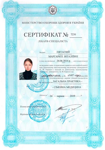 - В 2012 году Пятаева Маргарита Витальевна окончила с отличием обучение в Донецком национальном медицинском университете им. М. Горького по специальности "Лечебное дело" и получила квалификацию врача.